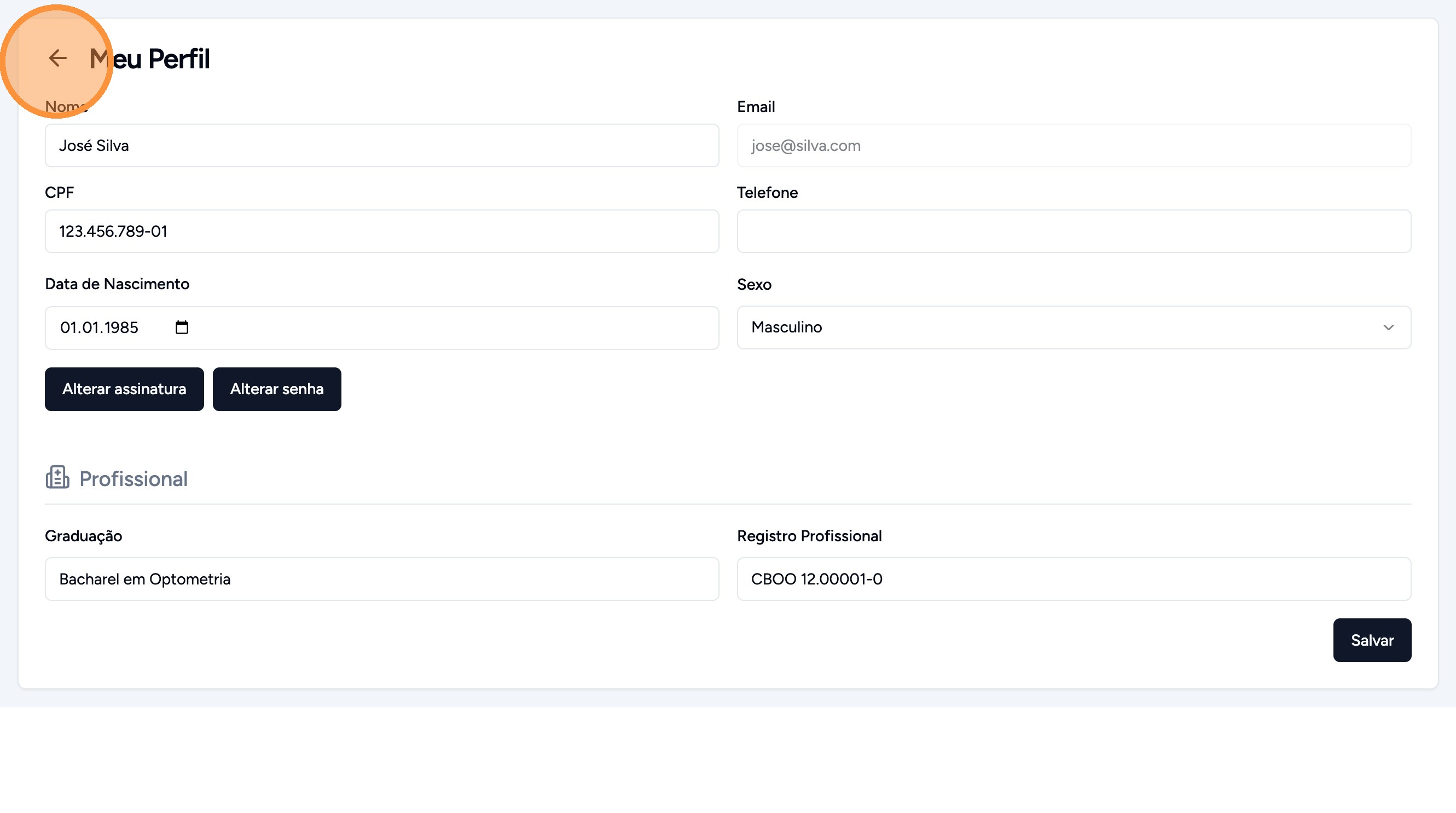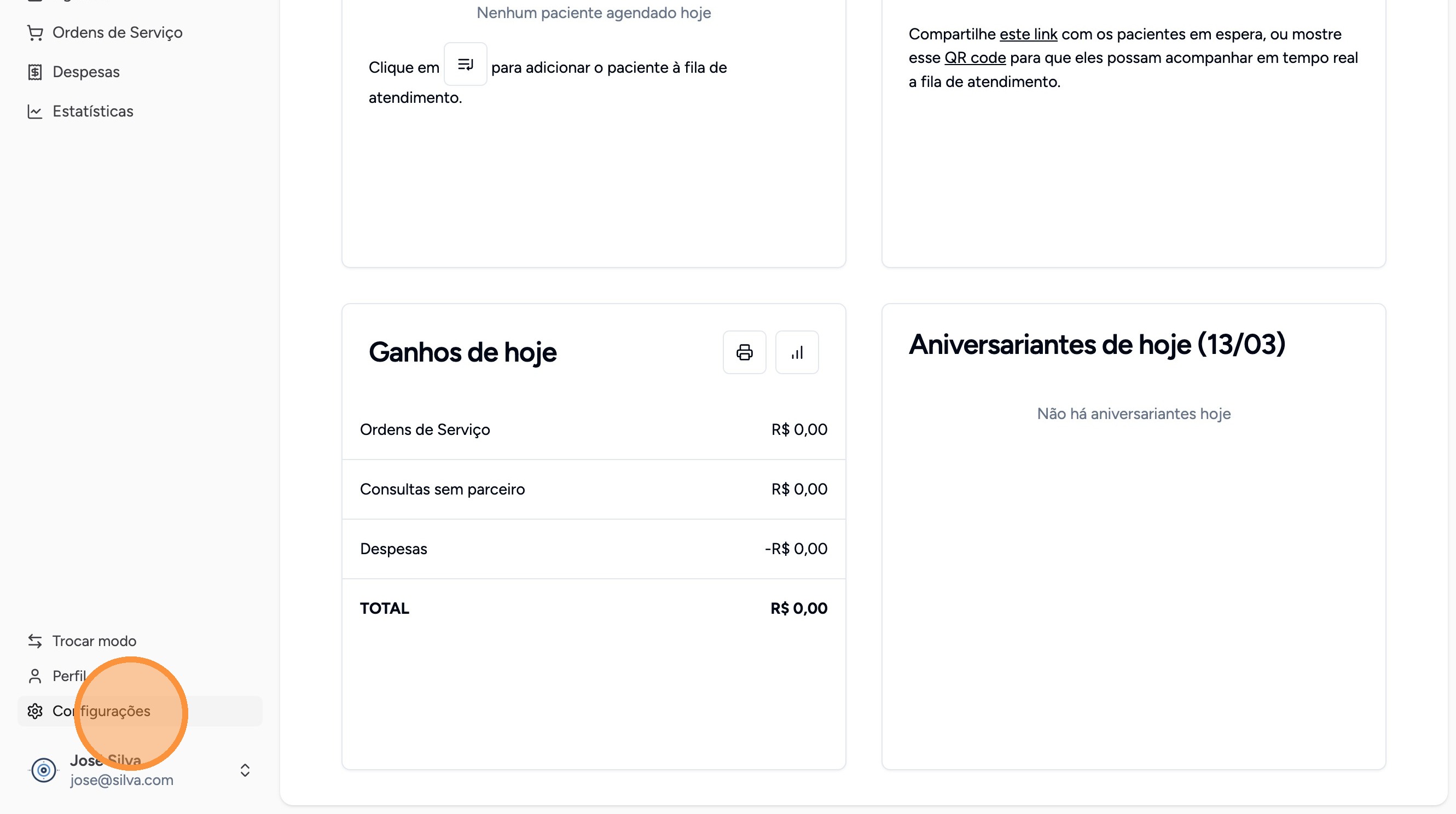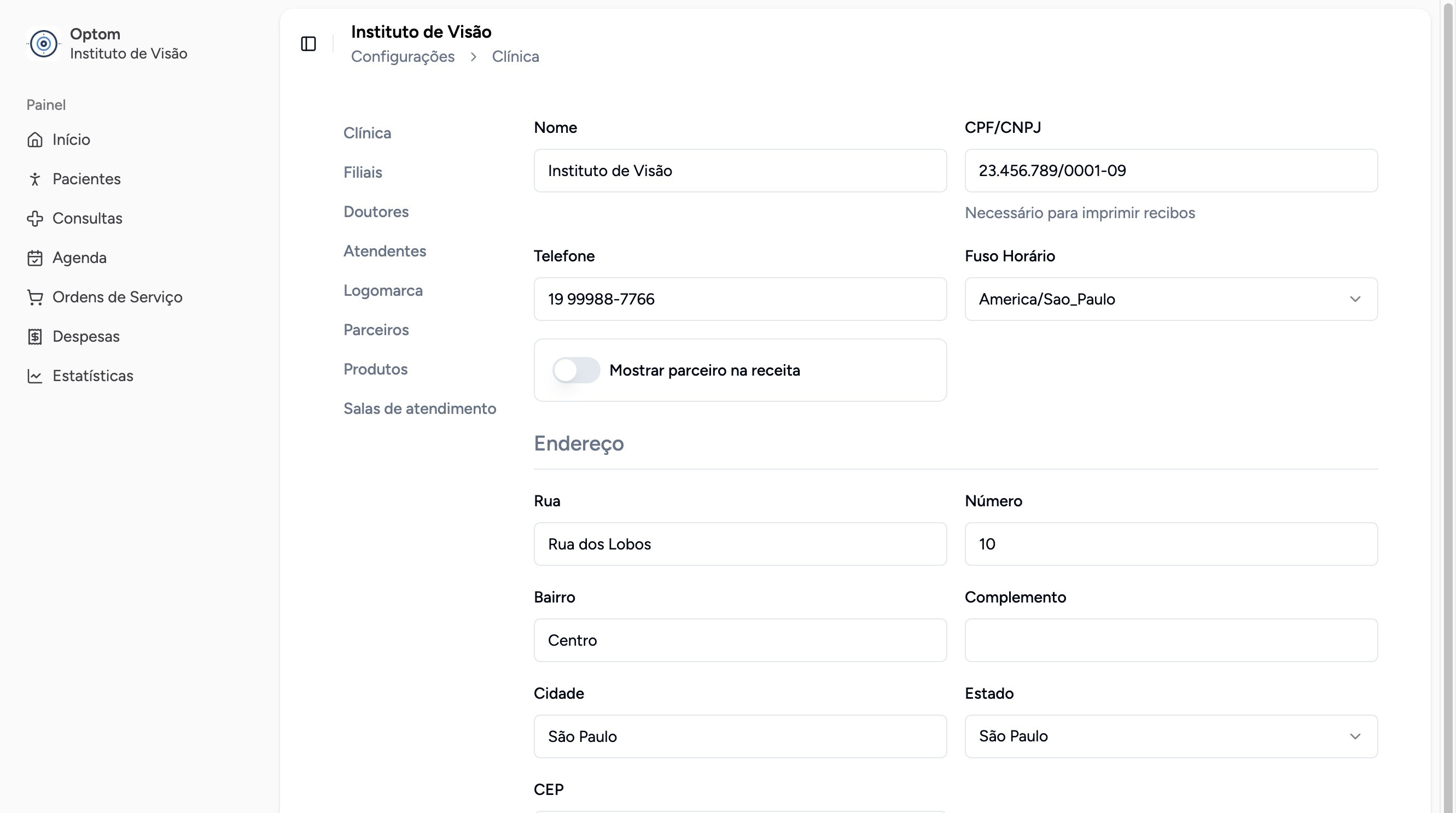 Preencha os dados da sua clínica e clique em "Salvar" no canto inferior direito da página