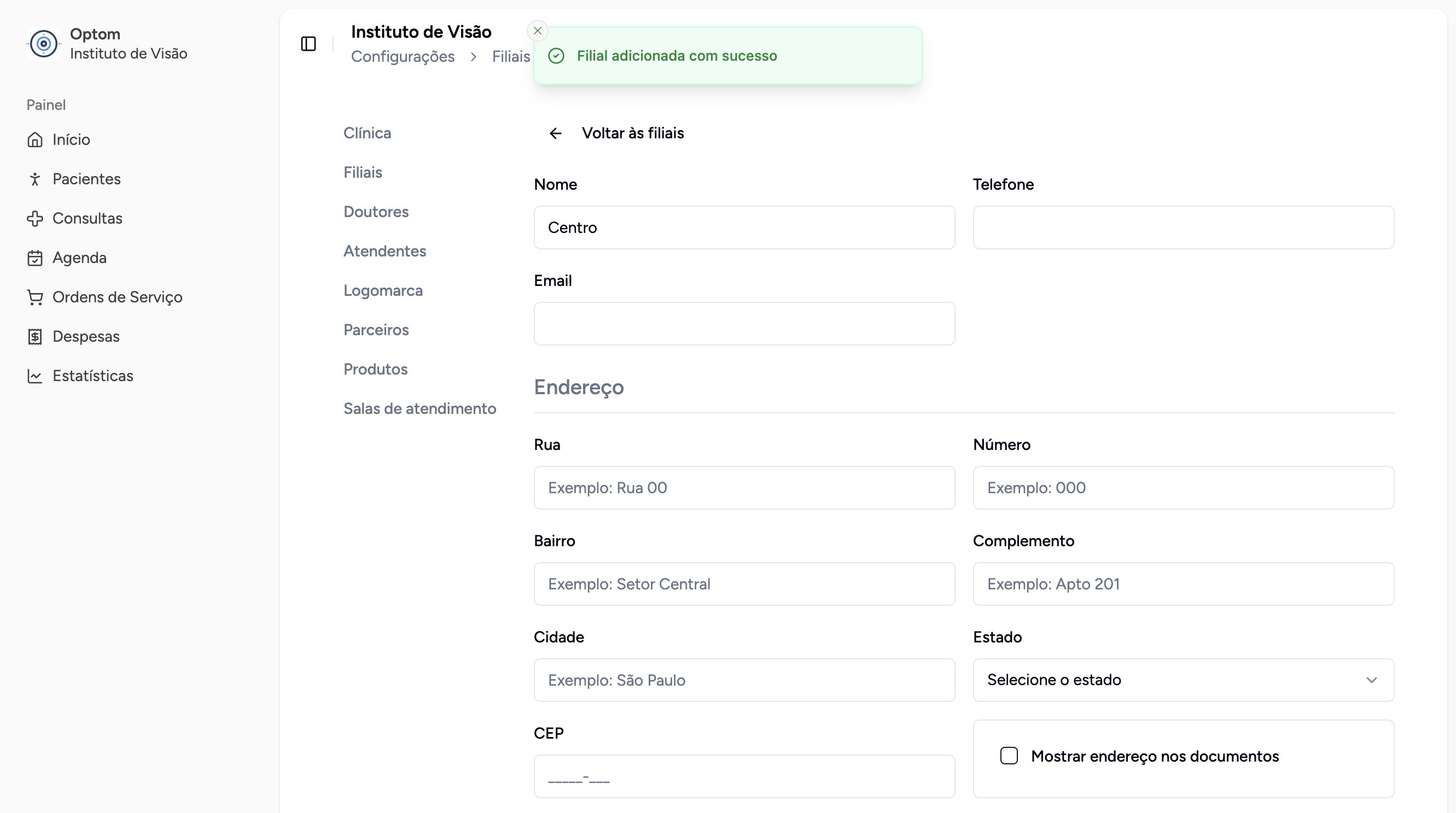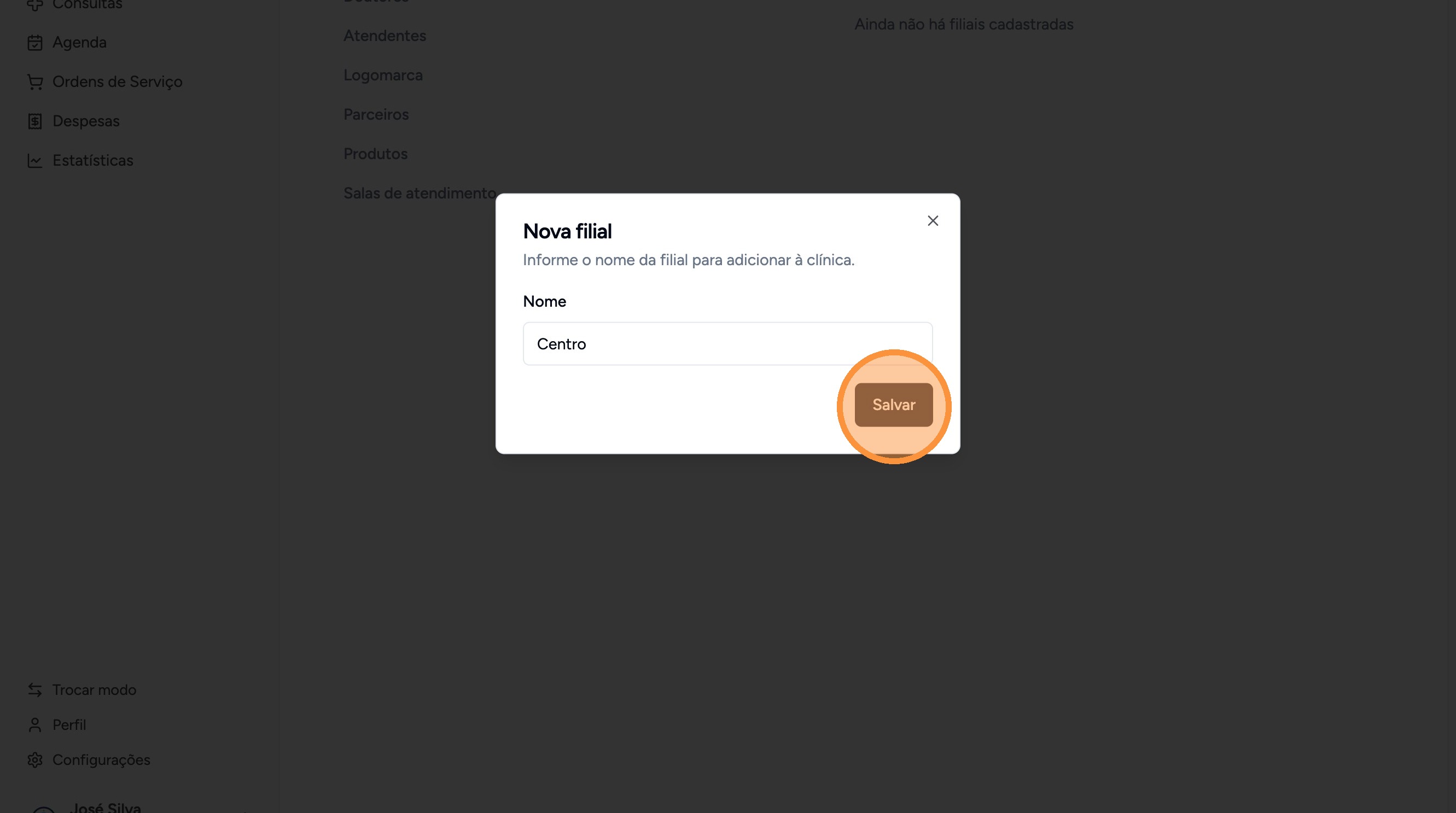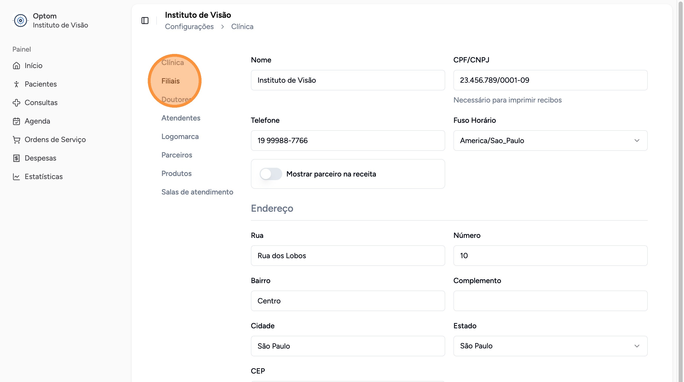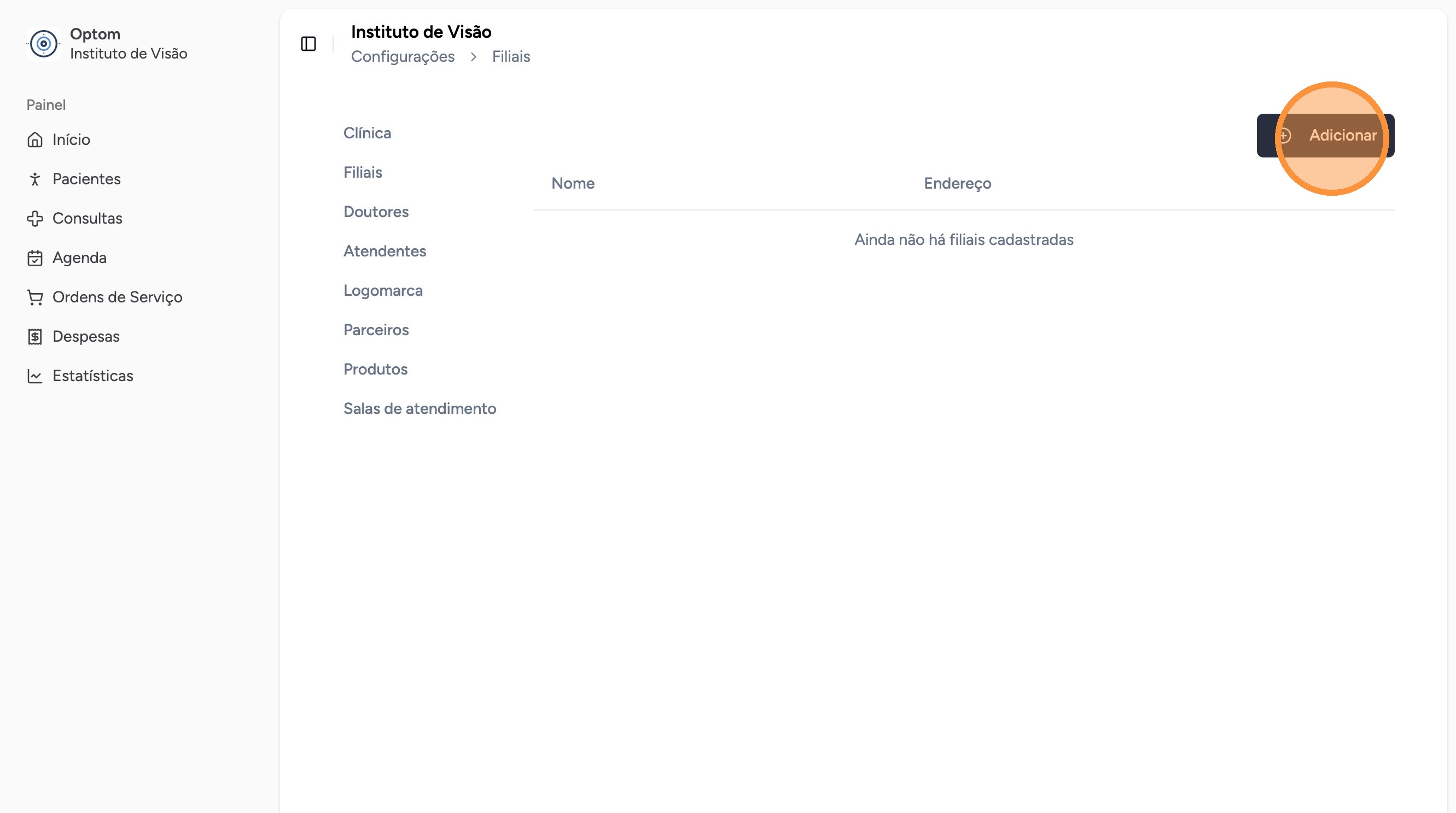 Caso sua clínica tenha filiais, as gerencie clicando em "Filiais"