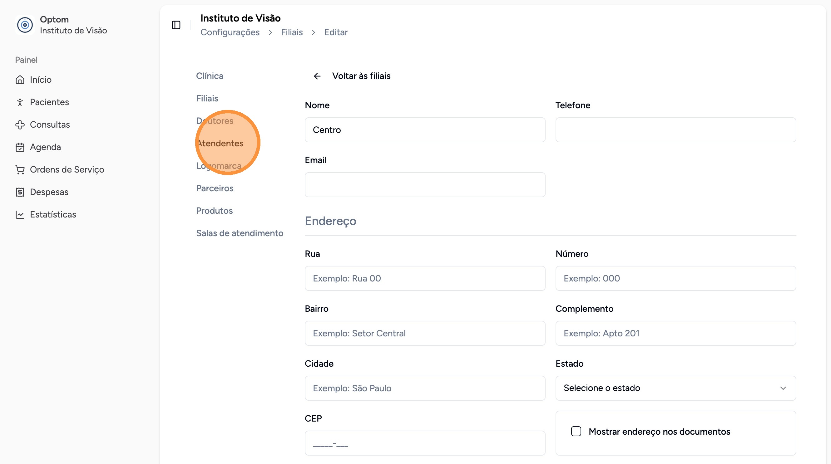 Caso sua clínica trabalhe com atendentes, os gerencie clicando em "Atendentes"