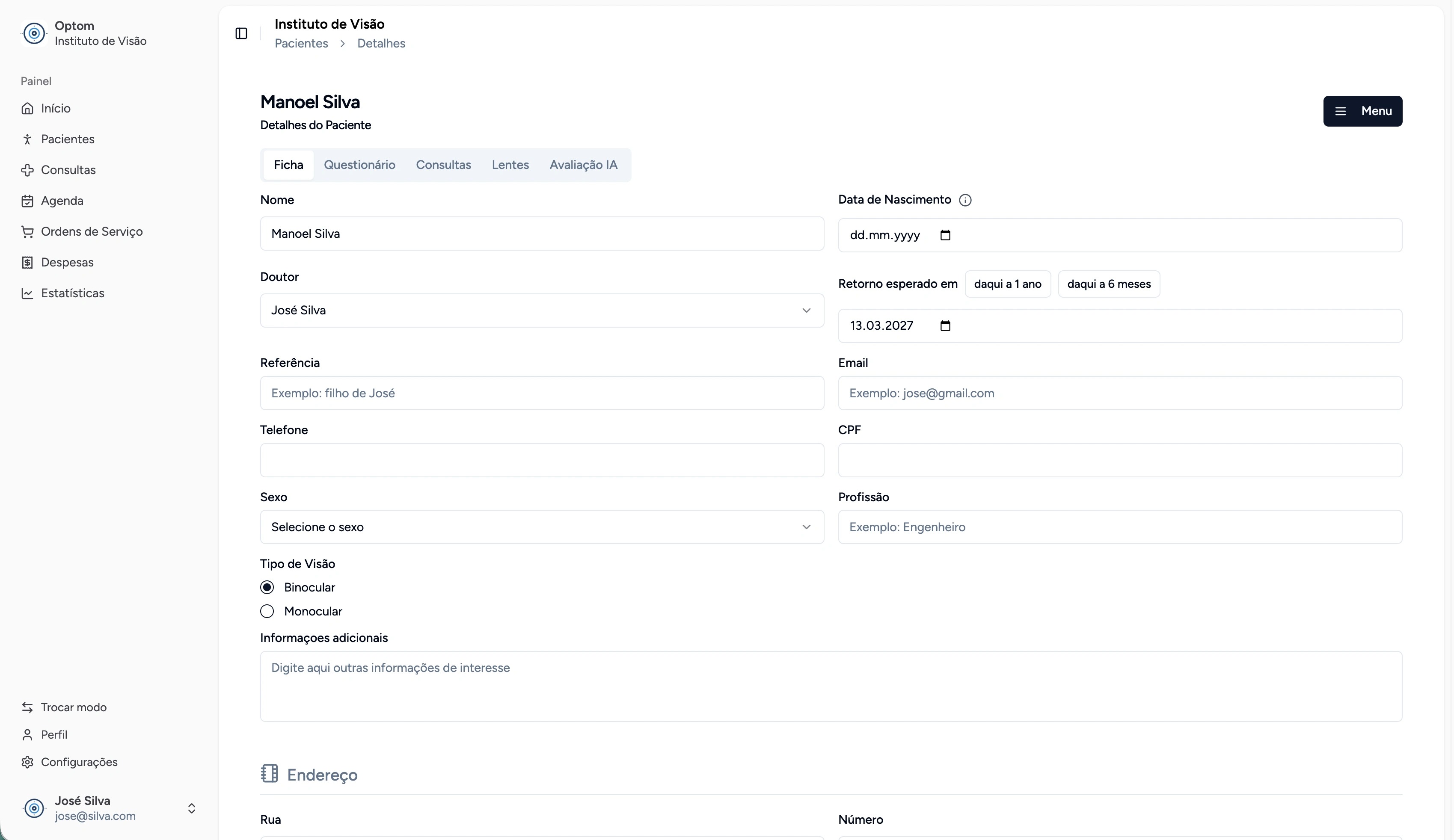 A ficha do paciente pode ser acessada tanto pelo optometrista quanto por um atendente.