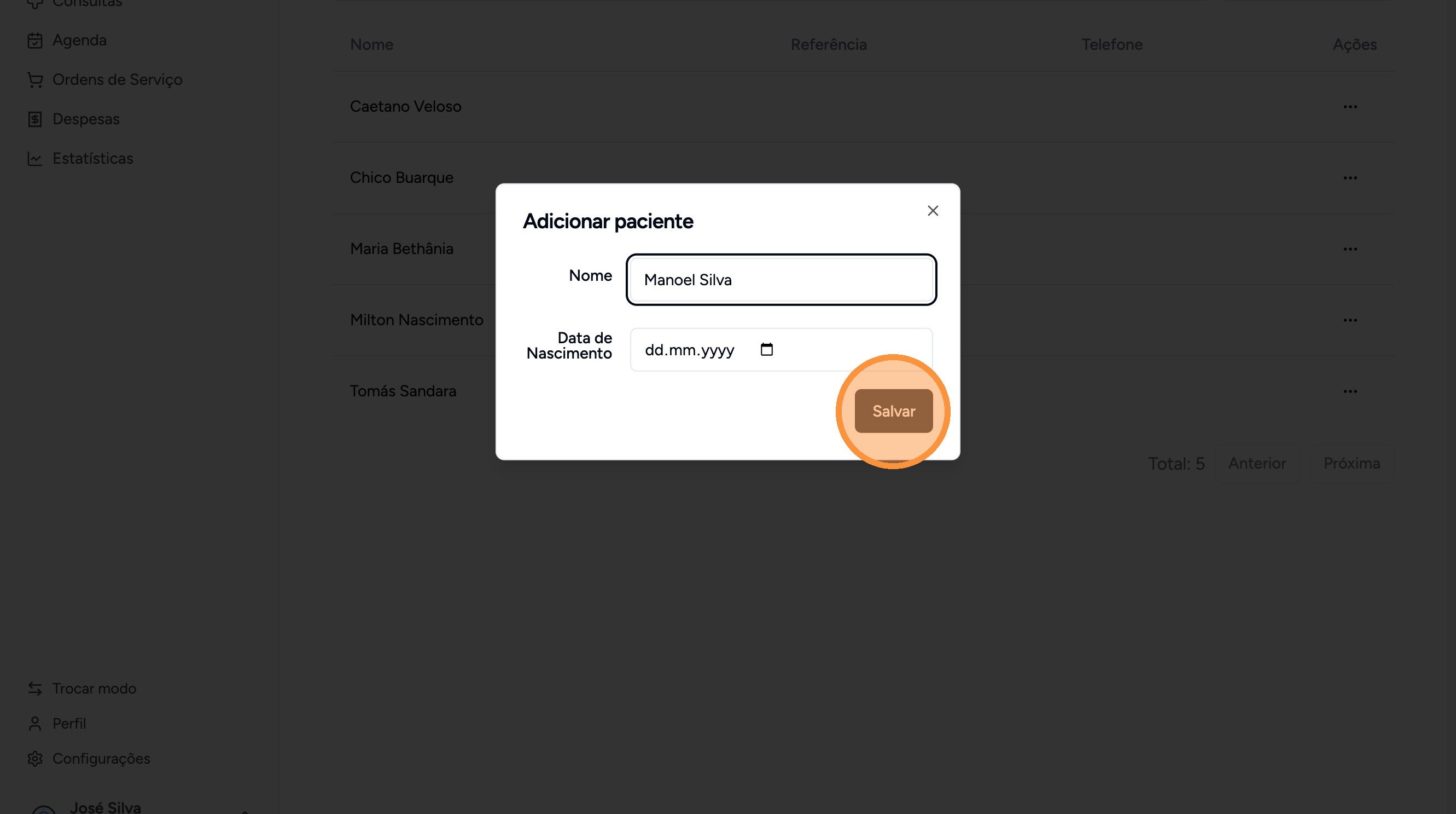 Preencha o nome e data de nascimento do paciente e clique em "Salvar"