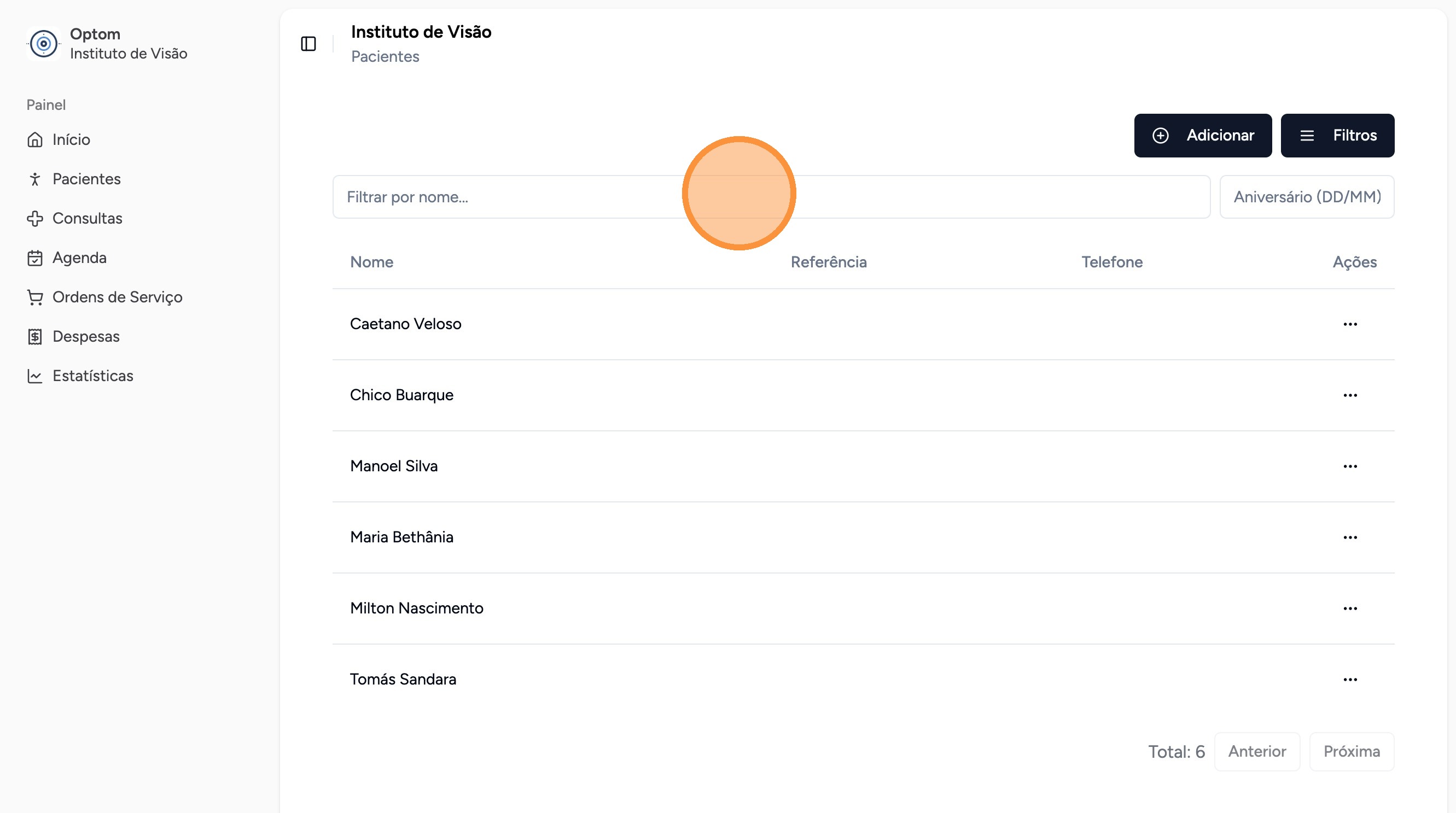 Caso o paciente já tenha sido cadastrado, clique no campo "Filtrar por nome..." e digite pelo menos parte do nome do paciente que procura