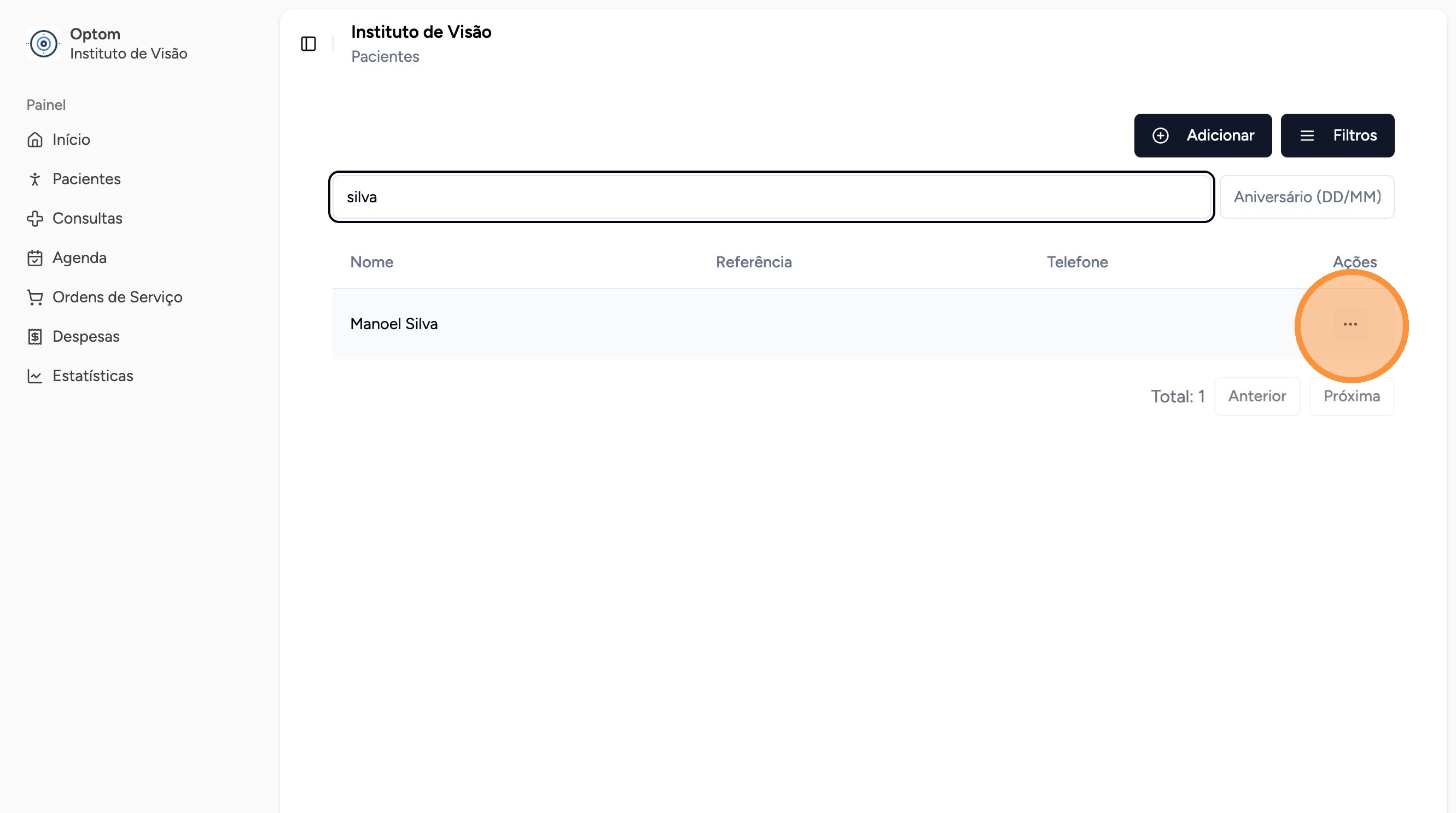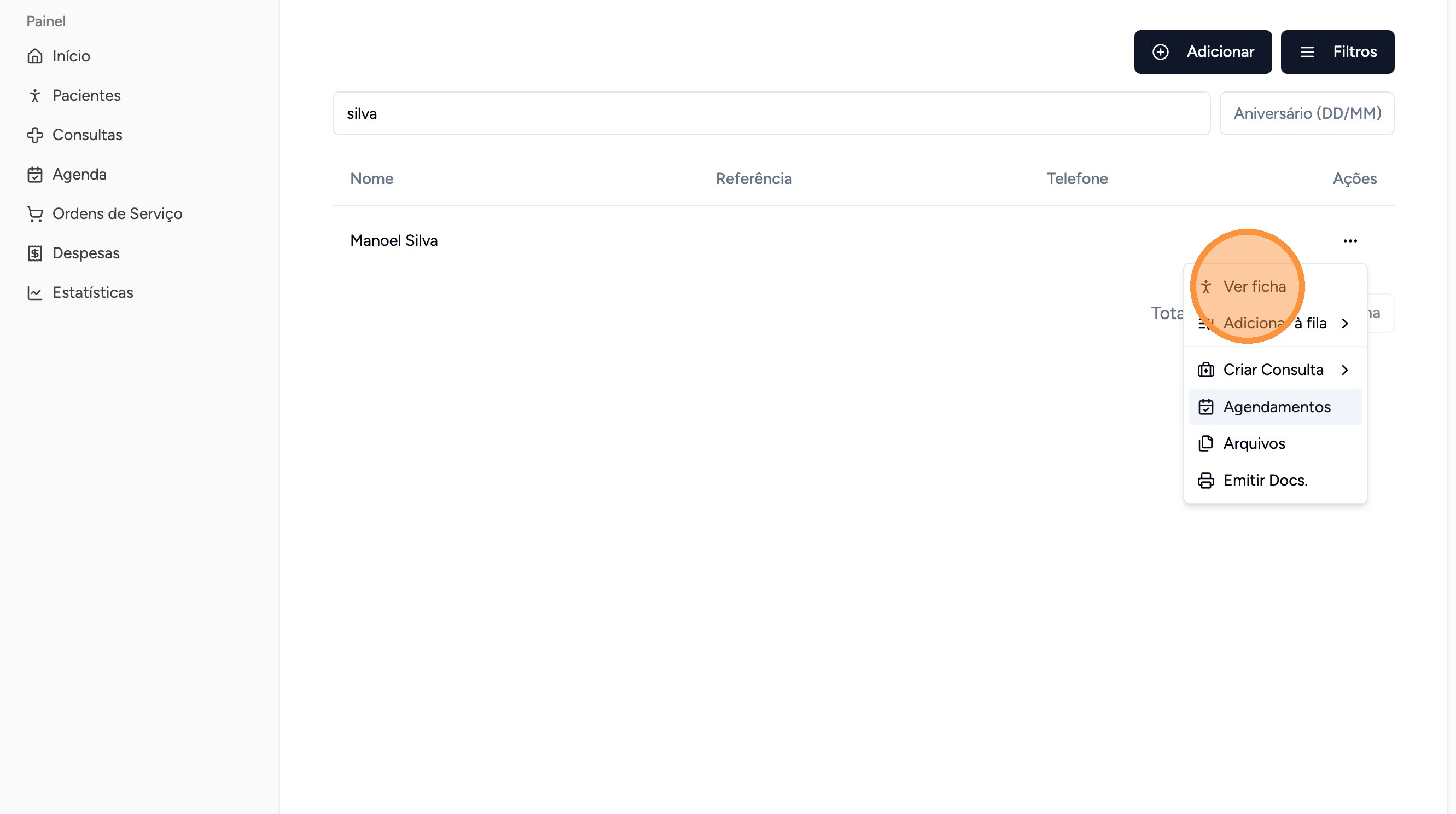 Clique no botão de ações "..." do paciente desejado