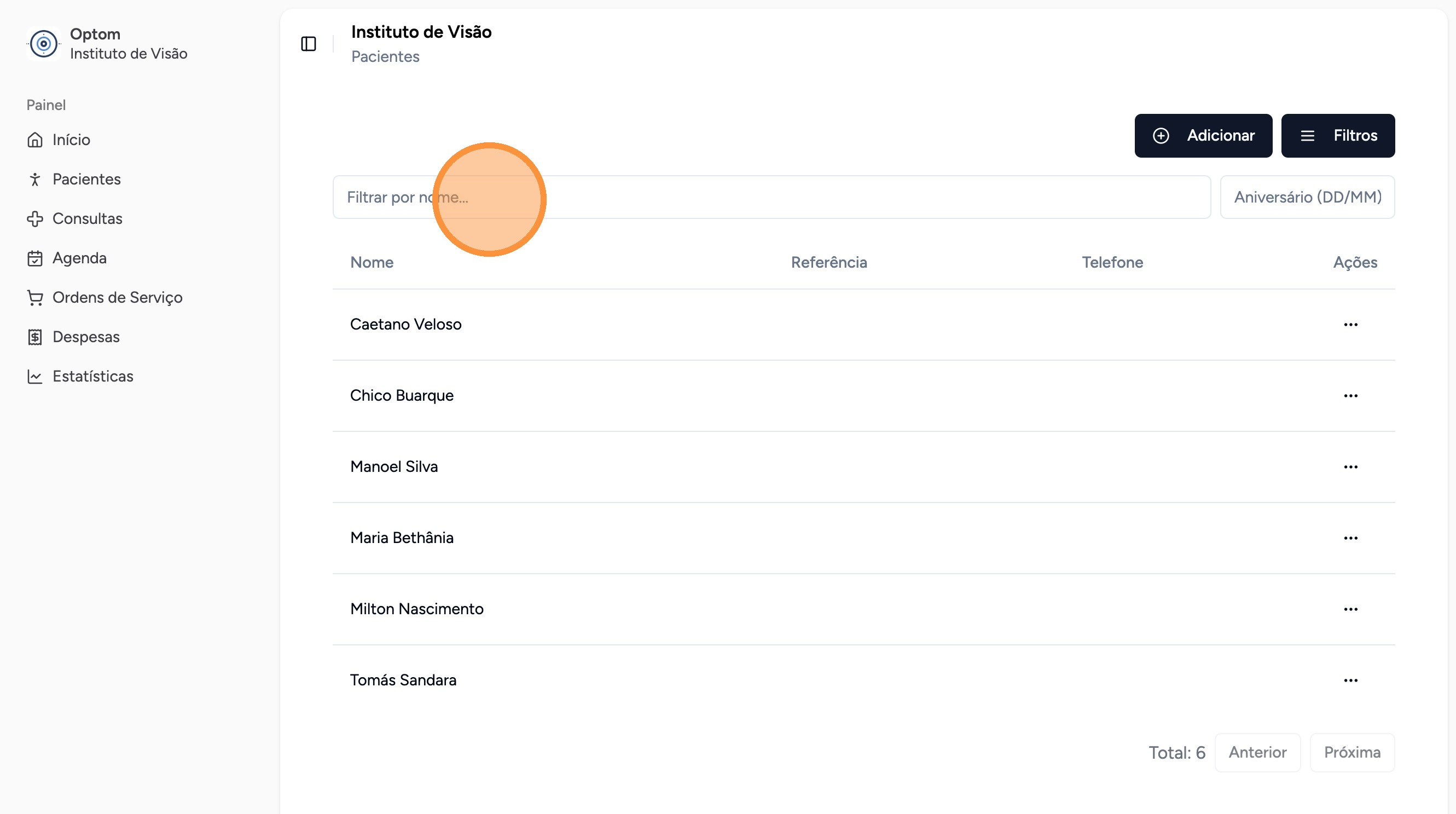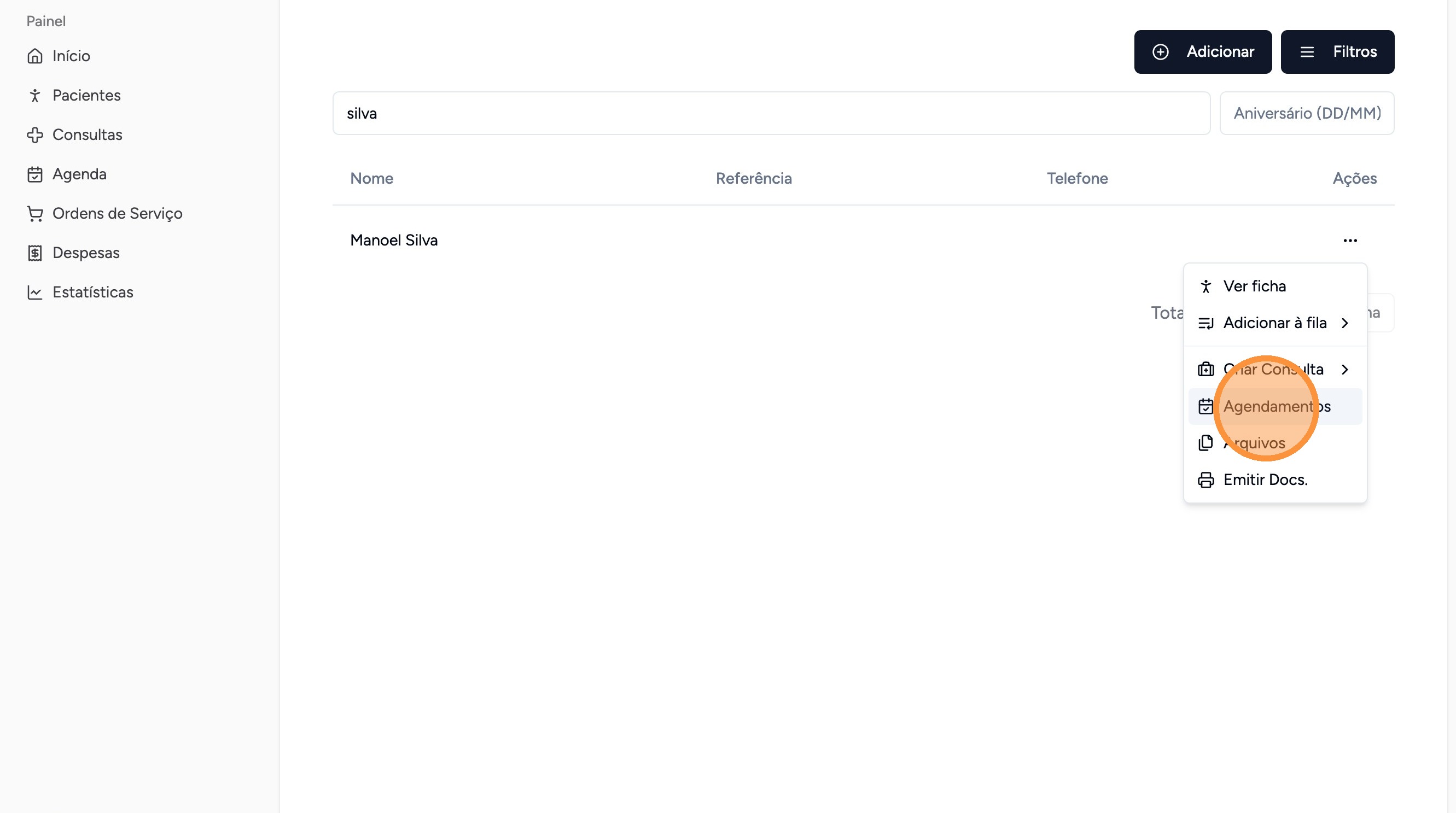 Digite "silva", por exemplo, e clique no botão de ações "..." do paciente desejado