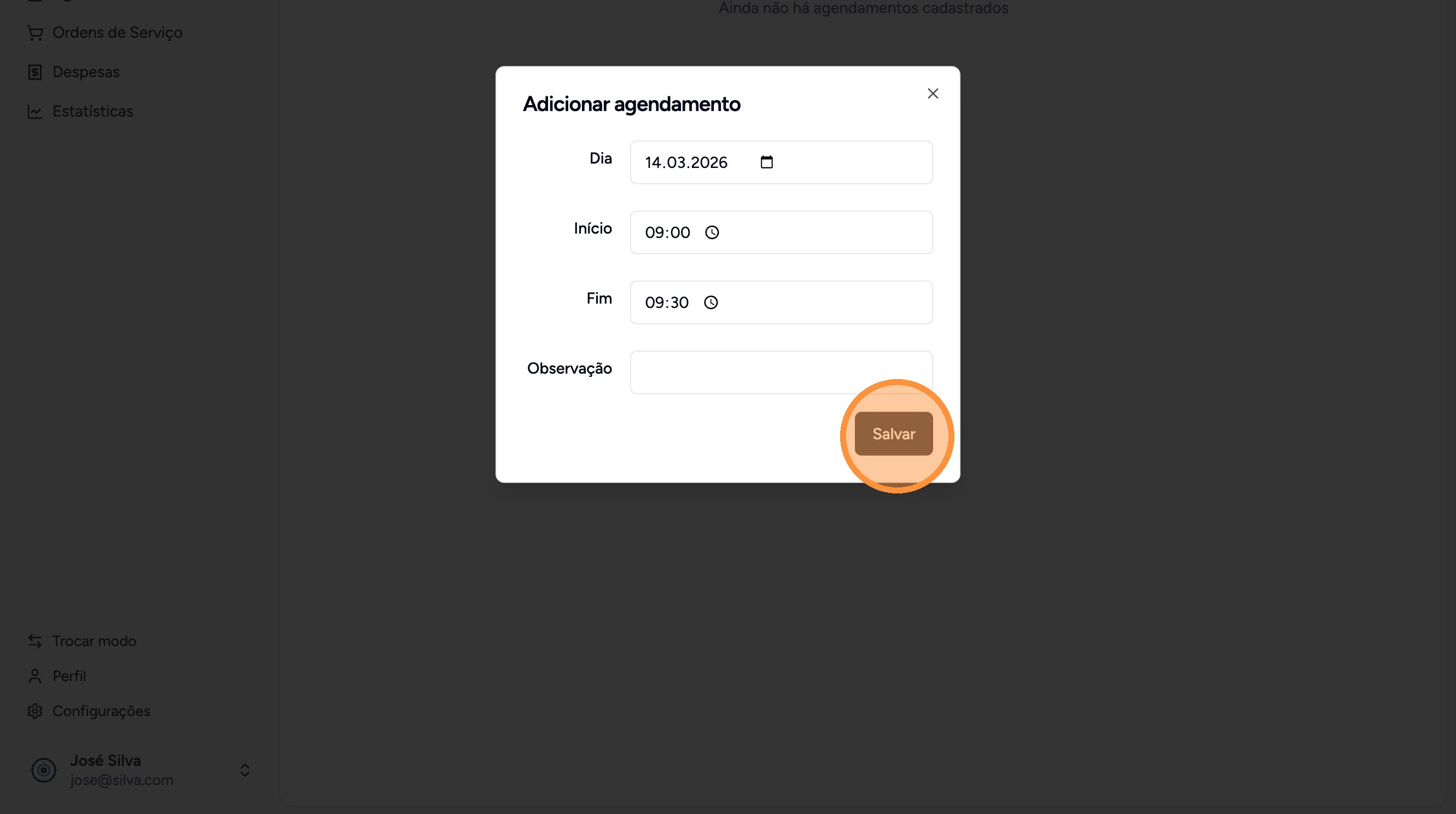 Escolha a data e horário do agendamento e clique em "Salvar"