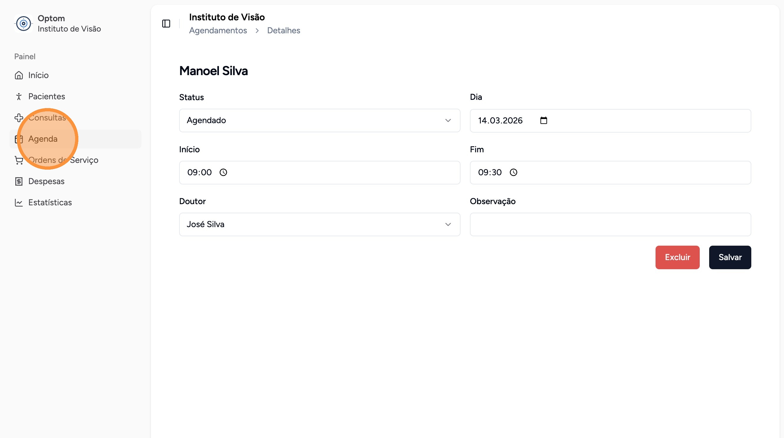 Pronto, o paciente foi agendado! Nesta tela você pode editar ou excluir o agendamento criado. Para ver sua agenda, clique em "Agenda"